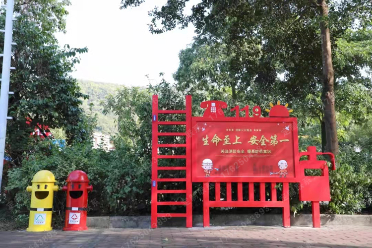 消防主題公園共有8把“消防”休閑椅,椅腳巧妙設(shè)計成“119”造型,用于火災(zāi)報警。